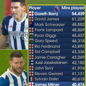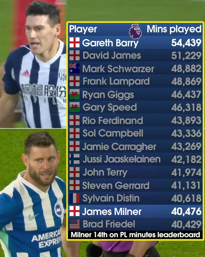 据英超官方数据显示,加雷斯-巴里比詹姆斯-米尔纳多踢了超过13,900分钟的英超联赛。