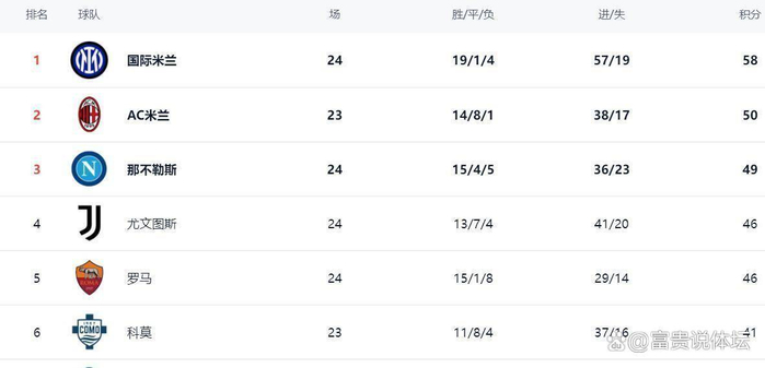 这两场比赛的结果,直接导致意甲积分榜从第三名到第七名的区域发生了剧烈震动。我们来看看最新的排名情况。领头羊依然是国际米兰,他们24轮战罢拿到了58个积分,战绩是19胜1平4负。国米虽然输球的场次有4场,不算特别少,但他们的平局极少,赢球的场次是全联赛最多的,这种“非胜即负”的抢分模式让他们稳稳占据了榜首位置。