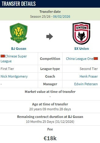 德转:王宇翔从北京国安加盟陕西联合的转会费约15万人民币