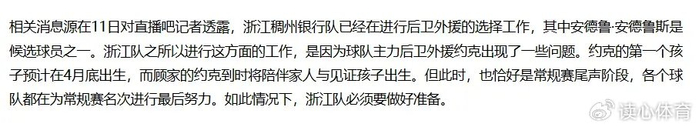 浙江稠州官方宣称外援约克因妻子分娩需要陪伴离队,其实还是对其本赛季状态不太满意,毕竟上赛季所找的大外援帕里斯-巴斯也是因同样原因离队后便一去不复返了,目前浙江稠州3名外援2大1小,兰道夫表现稳定可当主力,因此有消息称,浙江稠州第4外援将在安德鲁斯与卡里克-琼斯之间2选1,前者同样来自澳洲NBL联赛,后者则是稠州旧将,曾帮助球队杀进过总决赛。