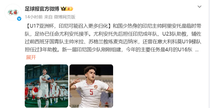 据《足球报》的最新报道,印尼足协将U17国家队的主教练进行了更换,已任命尤利安托为新任主教练,后者先后担任印尼成年队、U23队助教。