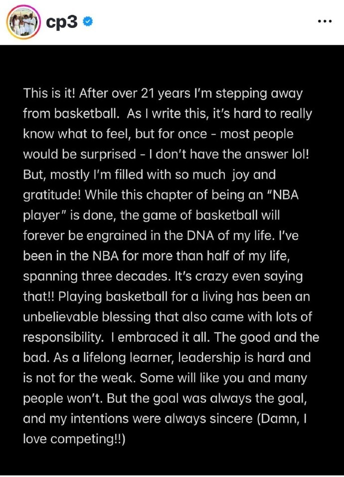 就这样,在经历超过21年NBA生涯后,我将告别篮球生涯。当我写下这些文字,我确实很难真正去体会内心情感,但这一次大多数人可能会感到惊讶,对此我并没有答案。