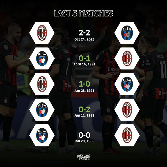 米兰近5场对阵比萨3胜2平保持不败