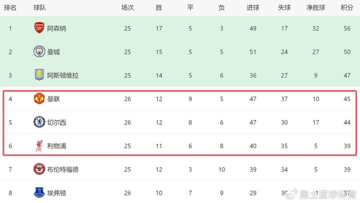 值得一提的是,除了曼联之外,这一夜切尔西也没能击败利兹联,他们在主场2-2战平对手,也才拿到1分。截至目前,曼联依然排名第四,切尔西则以1分之差,排名第五。虽然争四2强都没能获胜,但是他们的位置,暂时还非常稳固。
