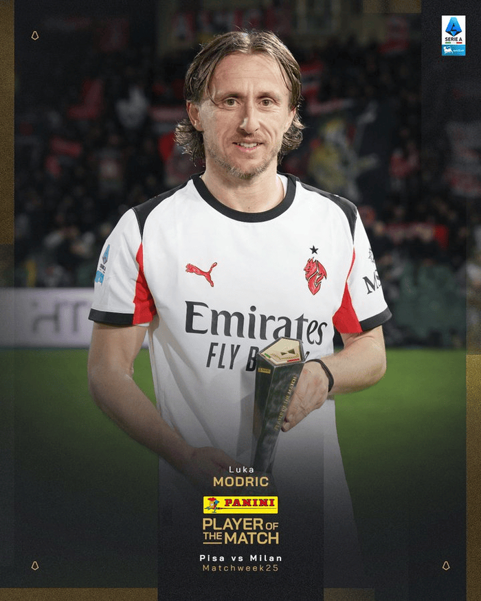 意甲官方:莫德里奇当选为AC米兰vs比萨全场比赛最佳球员