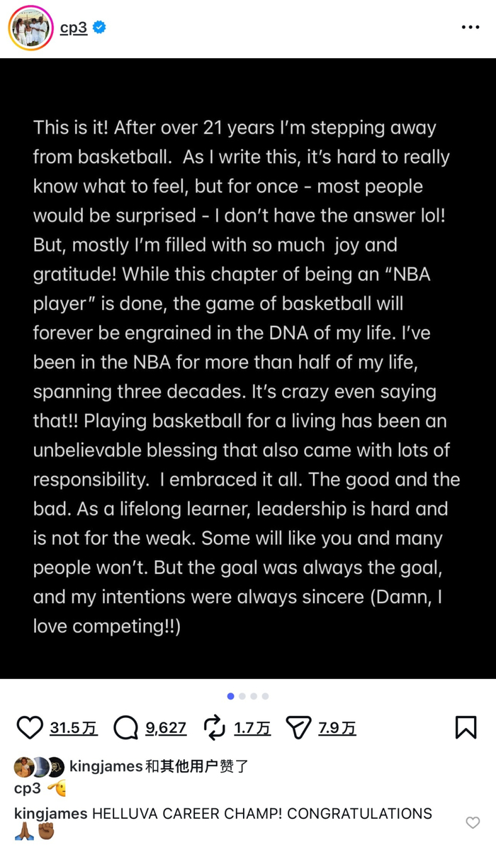 保罗在社媒宣布自己退役的决定,詹姆斯点赞并留言:“传奇生涯,冠军!恭喜你 🙏🏿✊🏿”