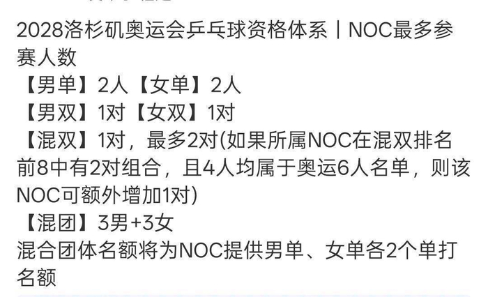 2026年2月13日,国际乒联官宣,首次公布洛杉矶奥运会名额分配情况,其中混双允许两对组合参赛,打破以往老规定,迎来重大改革,这对国乒而言是利好,但同时避免不了有人身兼四项。