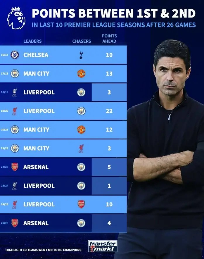 对此,德转统计了近10个赛季英超26轮战罢后,积分榜前两名球队的积分差距情况。数据显示,高亮标注的榜首球队最终成功捧起冠军奖杯,而近10年里共有3支榜首球队在后期被逆转、无缘冠军,其中就包括2022-23赛季曾以5分优势领先曼城的阿森纳,最终遗憾丢冠。
