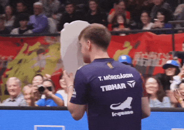 在已经确定晋级后的第五盘比赛,莫雷高德拿起樊振东的大头照挡在自己面前与对手进行比赛。