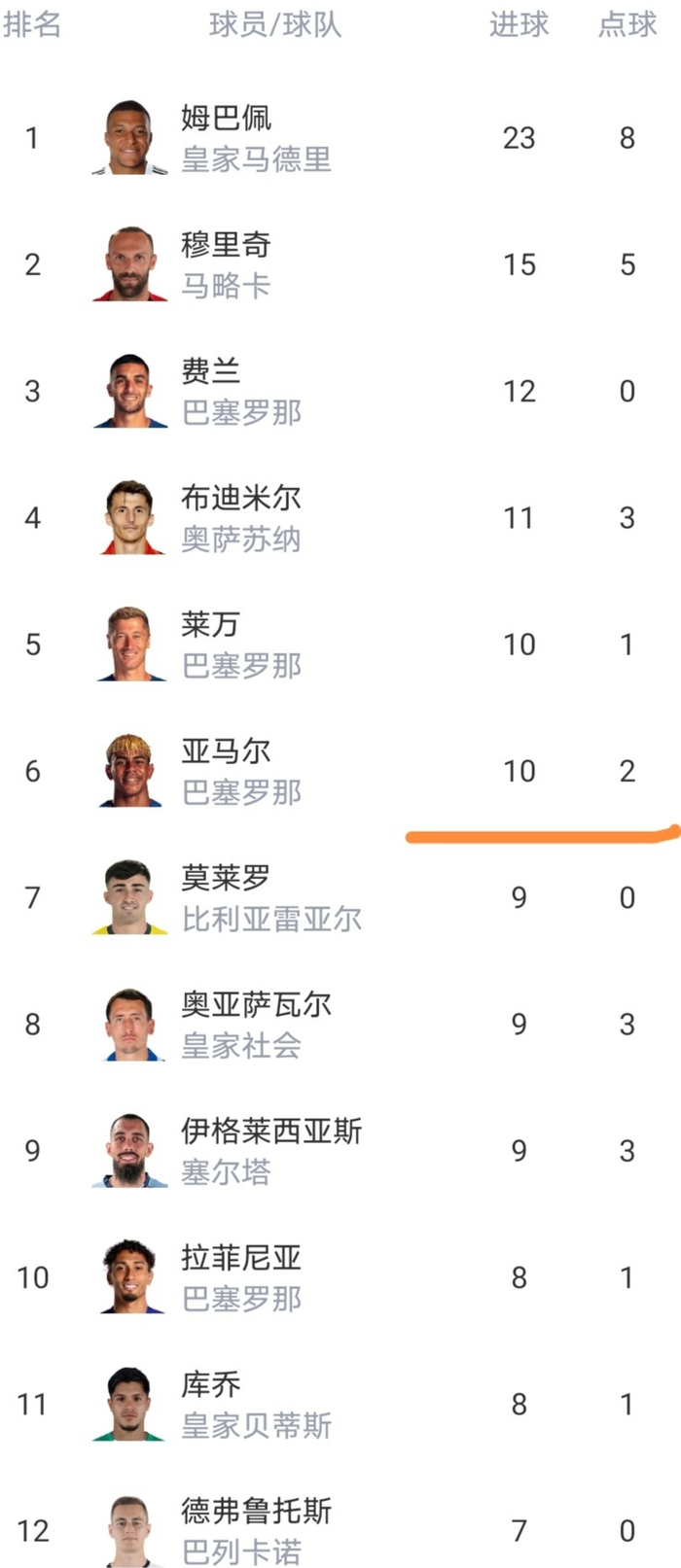 射手榜亚马尔也已经打入了上双的进球了,射手榜前六有3名巴萨的球员,而姆巴佩依然以较大优势领跑。可以说西甲金靴的争夺悬念不是很大,只要姆巴佩保持如今的状态,夺金靴是早晚的事情。