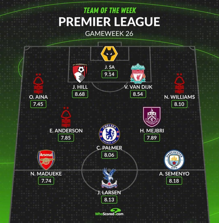 著名统计网站WhoScored公布了本轮英超最佳阵容,狼队门将若泽-萨高分领衔,诺丁汉森林3人入选。