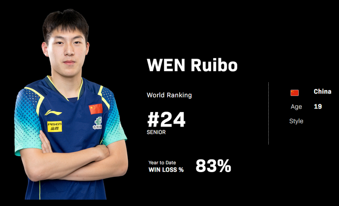 19岁的温瑞博在开年之后的势头也挺猛烈的,他在洛奥周期是国乒重点培养的身兼三项选手,他拿到了WTT马斯喀特常规挑战赛男单冠军、WTT多哈支线赛的男双亚军、WTT多哈球星挑战赛男单亚军、WTT多哈球星挑战赛男双亚军等,温瑞博男单排名世界第24。
