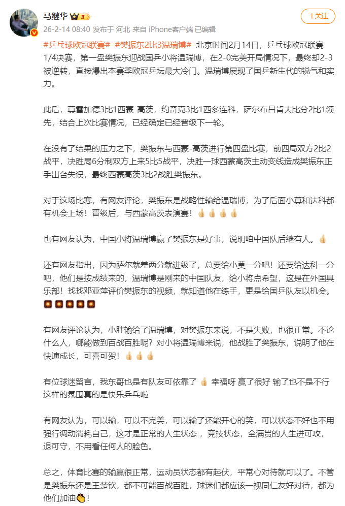 名嘴马继华评价了温瑞博:他表示温瑞博已3-2逆转樊振东,直接爆出本赛季欧冠乒坛最大冷门。温瑞博展现了国乒新生代的锐气和实力,中国小将温瑞博赢了樊振东是好事,说明咱中国队后继有人。