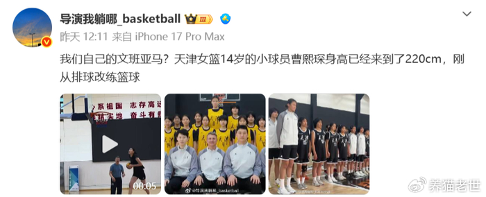 不过,值得一提的是,曹熙琛目前改打篮球还不到半年,但已经收到了不小的成效。考虑到只有14岁,而且,从曝光的视频上来看,曹熙琛在移动和跑跳能力上,更强于张子宇。如果能够抓住机会的话,她或许会成为中国女篮版的文班亚马。另外,根据知情人士透露,曹熙琛已经可以在训练中尝试扣篮了,这一点确实要略优于张子宇,后者直到去年才开启扣篮模式。