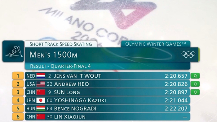 第四组孙龙和林孝埈上场。比赛开始,全部选手的起速非常慢,林孝埈和孙龙都是排在末尾。不过还有11圈,林孝埈来到领滑的位置,孙龙则在末尾。还有10圈,林孝埈和孙龙位居中间位,奈何在7圈的时候,林孝埈却摔了出去,这是遗憾。而孙龙在后续保持第四的情况下,能立马反超到第三的位置,整个过程孙龙还是背手的阶段。最后一圈,孙龙稳住第三,晋级下一轮。至于林孝埈,他没有完成比赛,导致无缘晋级。