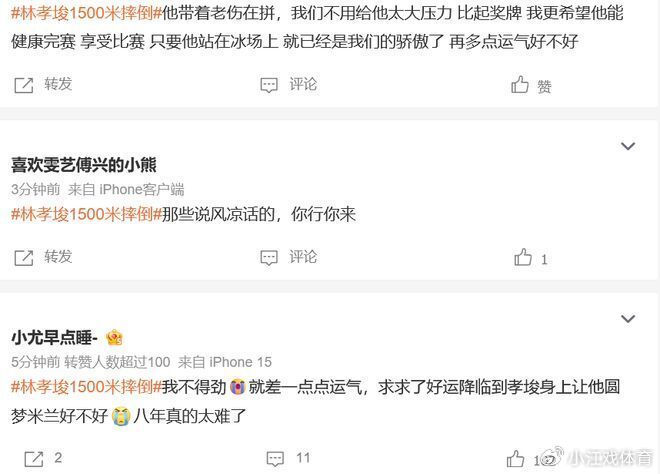 对于林孝埈摔倒,不少中国网友都纷纷表示心疼:“我真哭了!这场明显打得很积极,林孝竣状态也挺不错,结果又摔了,什么运气啊!首先希望林孝竣别受伤,其次希望林孝竣把所有运气都积攒给500米,这孩子太苦了,好运眷顾一下他吧”。