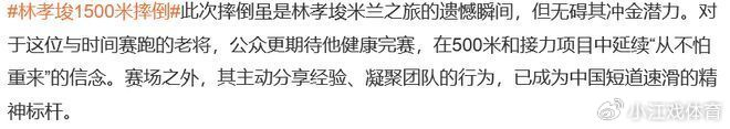 “此次摔倒虽是林孝埈米兰之旅的遗憾瞬间,但无碍其冲金潜力。对于这位与时间赛跑的老将,公众更期待他健康完赛,在500米和接力项目中延续“从不怕重来”的信念。赛场之外,其主动分享经验、凝聚团队的行为,已成为中国短道速滑的精神标杆。”