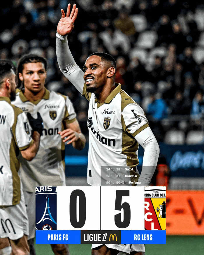 虎扑02月15日讯 法甲第22轮,朗斯客场5-0击败巴黎FC重回法甲榜首。