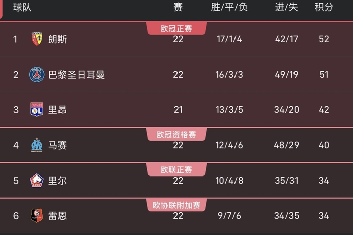 悬念再起,本轮过后朗斯反超大巴黎升至法甲第一