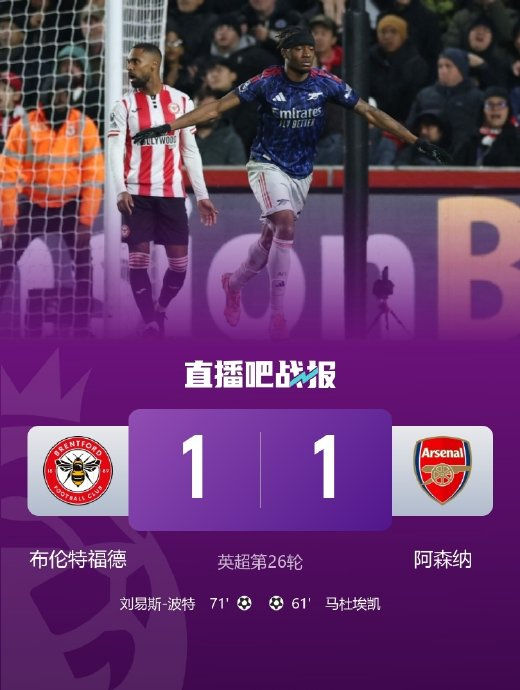 2026年2月13日的英超第26轮中,阿森纳客场1-1战平布伦特福德,争冠领先优势缩水至4分,马丁内利补时错失单刀绝杀成为最大遗憾。
