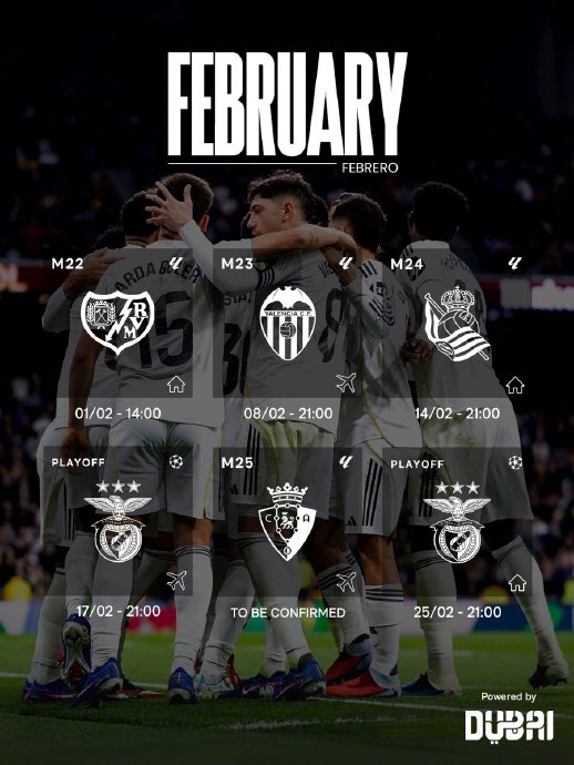 2. 欧冠生死双线:2月18日客场与本菲卡的附加赛首回合后,仅隔8天(2月26日)便需在伯纳乌进行次回合决战。次回合若失利将直接无缘欧冠16强,对球队士气与经济收益造成双重打击。