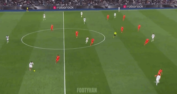 皇马拉开进攻宽度,阿诺德的长传调度,就能施展威力。从战术定位来看,阿诺德如同“右置进攻核心”,凭借精准的长传找到队友。足球场上,皮球总比人跑得快,阿诺德的传球,可以直接与锋线对接: