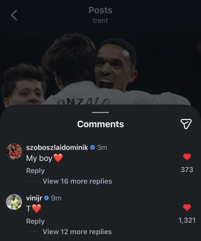 赛后,阿诺德更新社交媒体动态写道:“回来真好🤍”随后,维尼修斯、利物浦球星索博斯洛伊评论。维尼修斯写道:“T❤️”;索博斯洛伊写道:“我的男孩❤️”