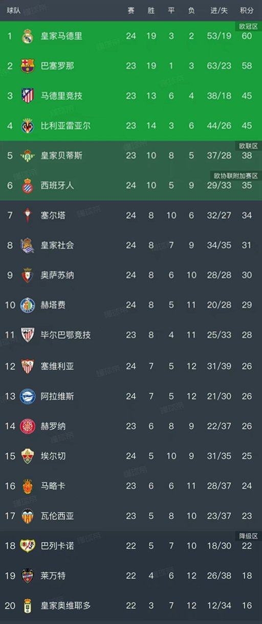 北京时间2月15日,西甲第24轮率先结束了5场比赛,我们看看最新积分榜的变动,主要的信息如下:皇马4-1大胜皇家社会,比利亚雷亚尔1-2不敌赫塔费、塞维利亚1-1阿拉维斯、西班牙人2-2塞尔塔、埃尔切0-0奥萨苏纳!