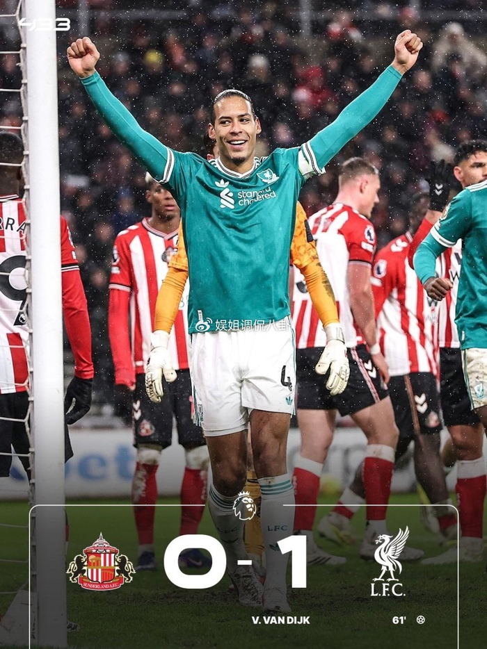 利物浦客场1-0战胜桑德兰,打破对手本赛季主场不败金身,积42分位居第6名,距离前四名3分。维尔茨中柱,范戴克头球打破僵局,萨拉赫角球助攻,远藤航伤退。