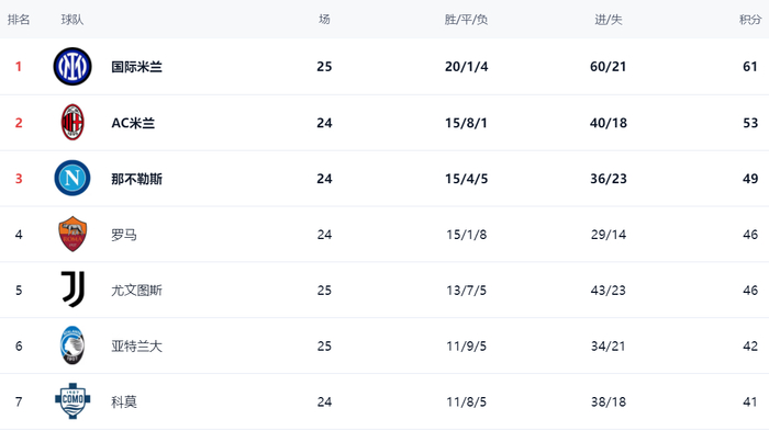 在积分榜上,此轮获胜的国际米兰以61分高居榜首。AC米兰拿到53分,排名第2。AC米兰足足比国际米兰少了8分。不过,AC米兰少赛一场。显然,国际米兰已经距离冠军越来越近了。那不勒斯只拿到49分,排名第3。落败的尤文图斯依然是46分,排名第4。罗马以46分排名第5。第6的是亚特兰大,拿到42分。科莫则被亚特兰大挤到第7的位置,总积分是41分。拉齐奥只拿到33分,排名第8。