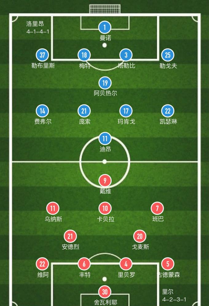 里尔(4-2-3-1):30-舍瓦利耶,22-维阿(82' 23-哲格罗娃),6-丰特,4-里贝罗,5-古德蒙森,21-安德烈,20-戈麦斯,11-乌纳斯(30' 27-巴约),10-卡贝拉(75' 18-迪亚基特),7-班巴,9-戴维
