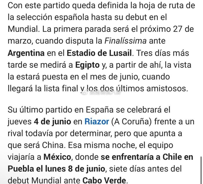6月4日,西班牙将举行在国内的最后一场热身赛,地点是拉科鲁尼亚,而且比赛当晚就直接飞往墨西哥,而据《马卡报》报道,斗牛士军团的对手可能是中国男足!