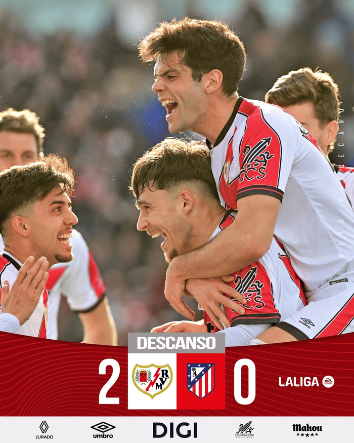 虎扑02月16日讯 西甲第24轮,巴列卡诺主场迎战马德里竞技,上半场比赛结束,巴列卡诺2-0领先。