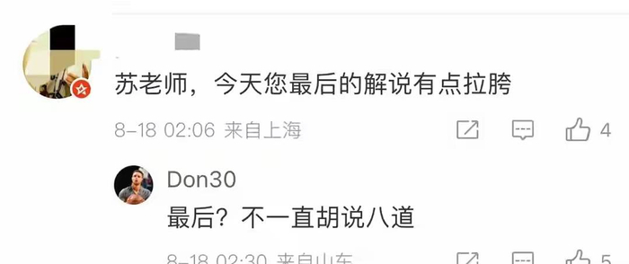 整场比赛,苏群的解说屡现“断片”时刻。从将赵睿的球衣问题误读为伤病,到无视澳大利亚犯规未满的战术背景,其言论被批“既不懂规则,又缺乏对球员的尊重”。有球迷尖锐指出:“解说不是复述比分,而是帮观众理解比赛——当胡明轩按教练布置执行战术时,解说却在用上世纪的内线思维指手画脚”。