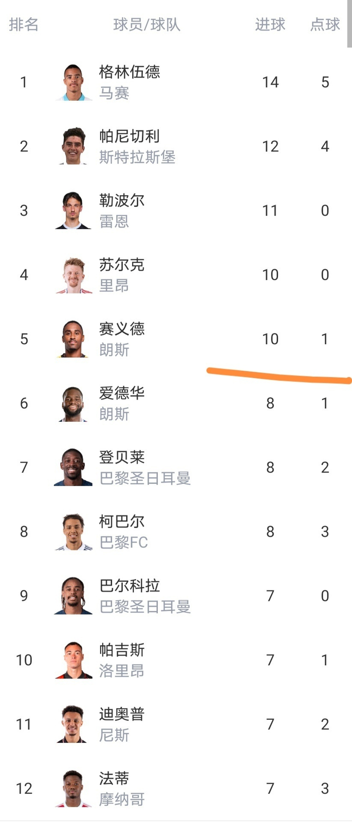 射手榜5人进球上双,格林伍德2球优势领跑。