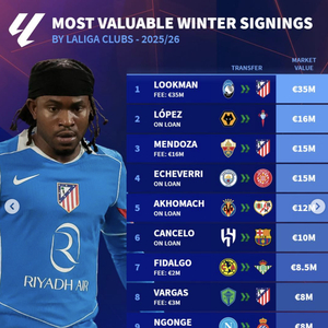 本季冬窗西甲球员转会身价榜:卢克曼3500万高居榜首