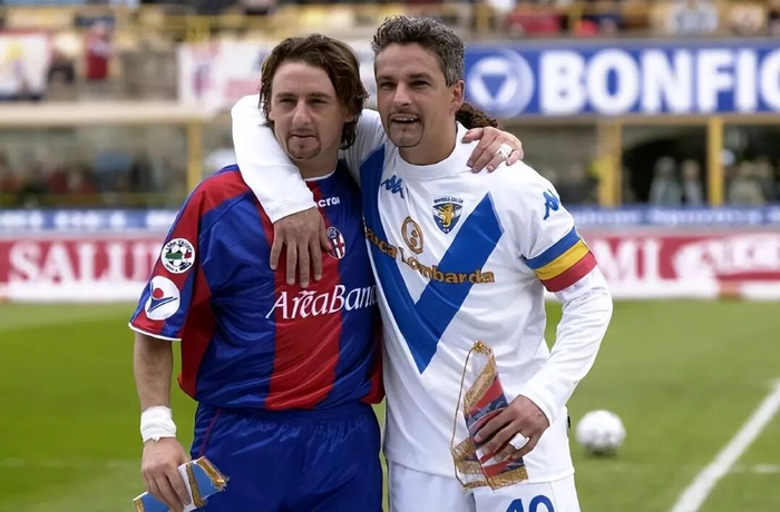 2003-2004赛季博洛尼亚队长西格诺里和布雷西亚队长巴乔亲密合影