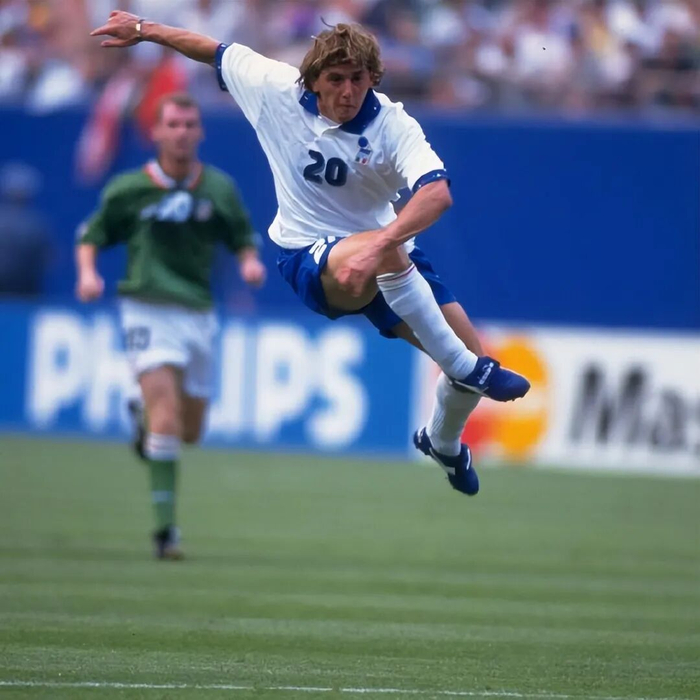 1994年世界杯上的蓝衣军团在慢热后渐入佳境,在艰难的从小组出线后,凭借巨星巴乔的神奇发挥一路过关斩将杀入决赛,可惜在决赛中点球大战惜败巴西。