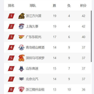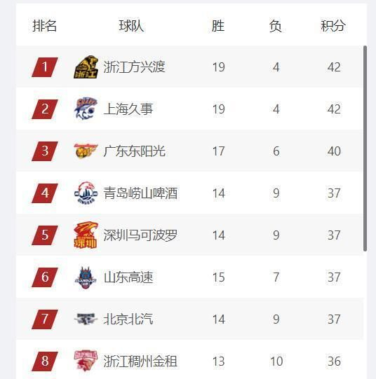 CBA常规赛第一阶段的比赛结束,目前浙江广厦队和上海队的战绩都是19胜4负,位列常规赛排名榜的前2,广东队以17胜6负的战绩排名第3;青岛队的战绩14胜9负排名第4,深圳队同样14胜9负排名第5,山东高速男篮15胜7负排名第6,北京首钢队14胜9负排名第7,浙江稠州队13胜10负排名第8。