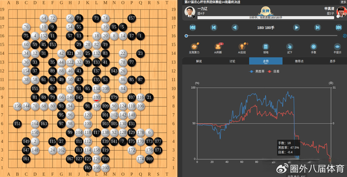 至180手,一力辽认负,申真谞没有翻车,拿到了前无古人的农心杯21连胜。不得不说,解说们的预测是真的准。