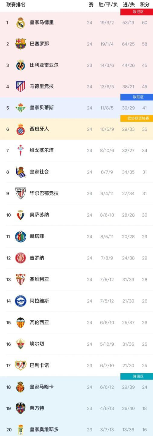 欧冠区同样胶着:比利亚雷亚尔23轮积45分暂列第三,马德里竞技24轮同积45分排在第四;两队一边是“少赛一场”的赛程优势,一边是经验与阵容厚度的底盘,接下来任何一轮的波动都可能改写前四排位。贝蒂斯41分排第5,西班牙人35分第6,身后的塞尔塔34分、第8的皇家社会31分、第9的毕尔巴鄂竞技31分咬得很紧,欧战名额争夺显然还远没到定局。