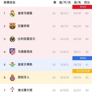 西甲第24轮战罢,争冠走势出现关键转折:领头羊皇家马德里在主场4-1击败皇家社会,24轮积60分升至榜首。与此同时,巴塞罗那本轮客场1-2遭逆转,24轮积58分降至第二,争冠压力陡增。