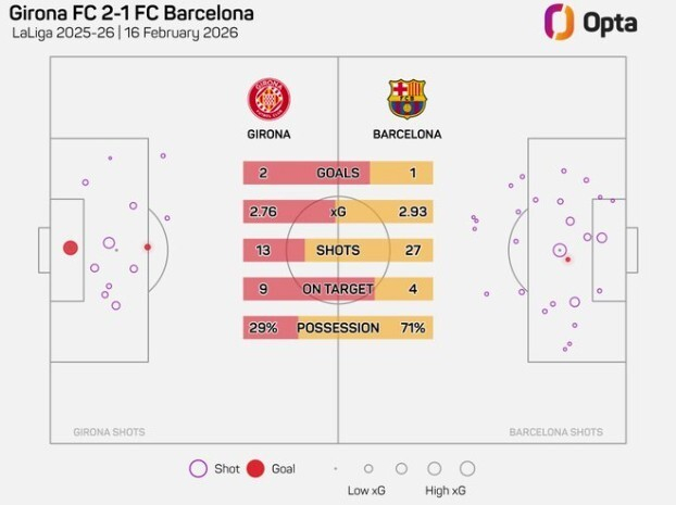 西甲单场至少26次射门输球,为巴萨自04/05赛季以来第二次