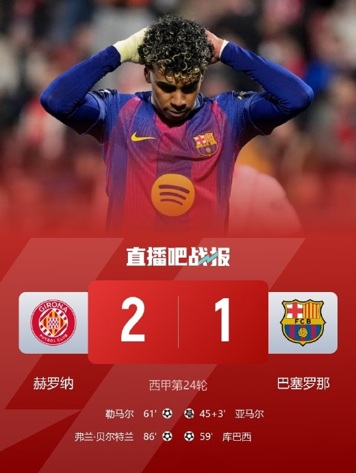 巴萨全场狂轰27脚射门,创2004-05赛季以来单场射门次数第二高却告负的尴尬纪录(仅次于2015年对阵塞维利亚的28射落败)。亚马尔除点球中柱外错失单刀,赛后遭球迷低分评价。此败令巴萨遭遇各项赛事两连败,积分停滞58分,赫罗纳则队史首次击败西甲领头羊。皇马凭借此役赛果,以60分反超巴萨登顶联赛。