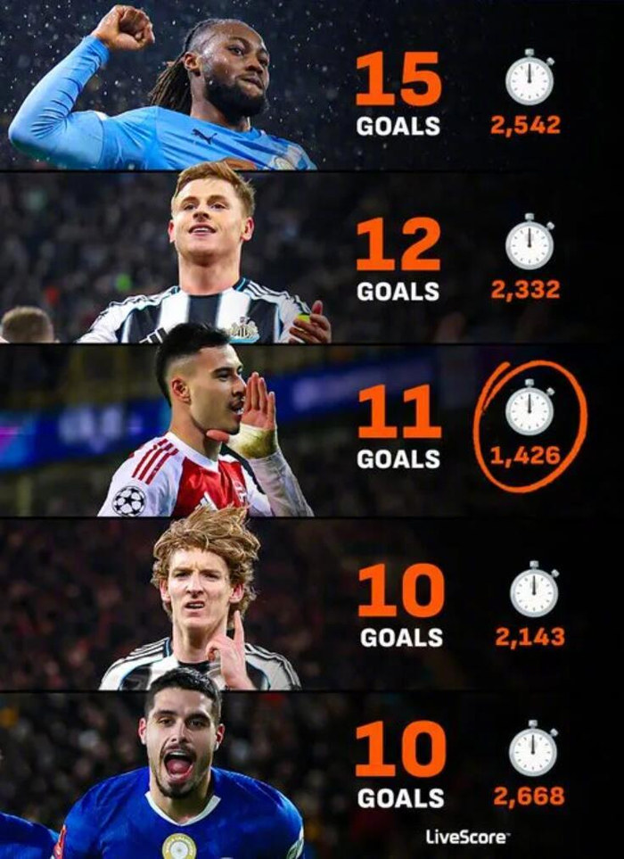 其中马丁内利是在出场时间最少的情况下做到这一点的。