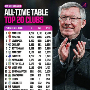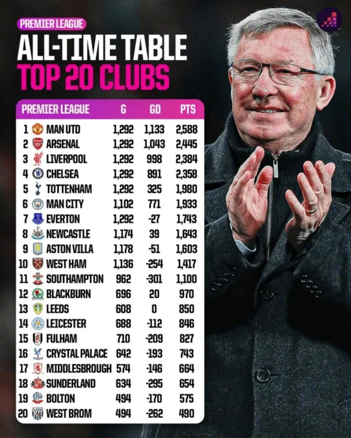 Opta Analyst统计了英超历史总积分榜,详情如下: