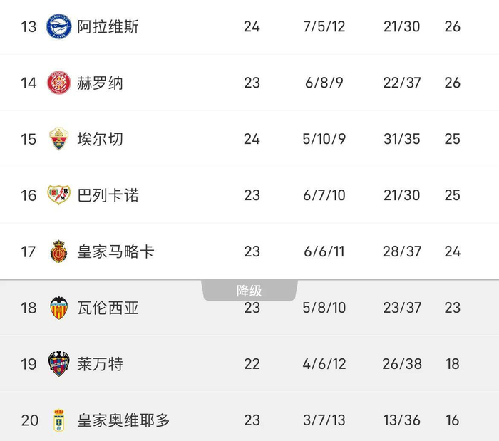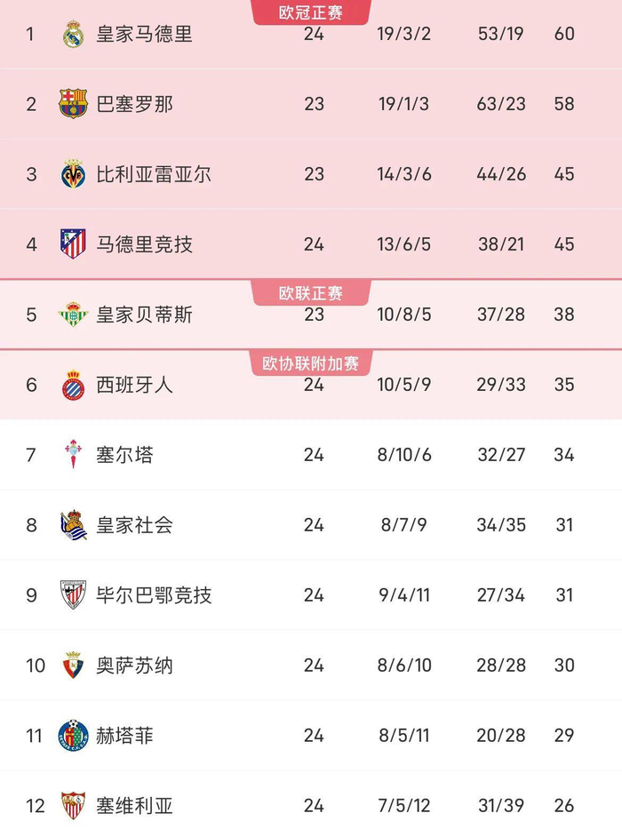 西甲最新积分榜如下: