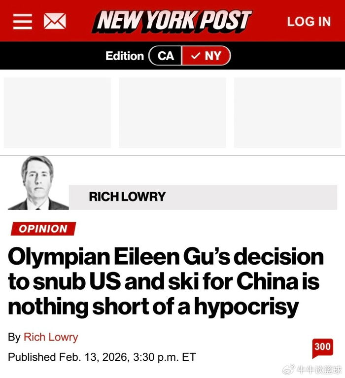 《纽约邮报》撰文称,谷爱凌“背叛”美国,代表中国,非常虚伪。而纵观整篇文章,看似在批评谷爱凌是美国的“叛徒”,为了钱选择中国,实际上则是在借此机会攻击中国。