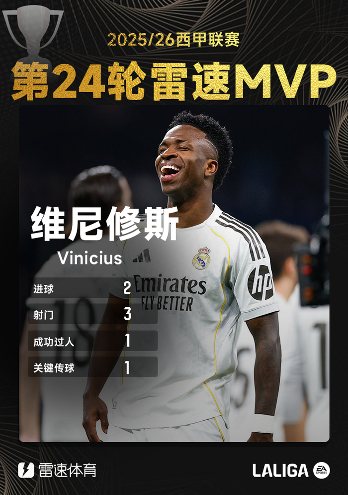 2025-26赛季西甲第24轮MVP评选结果出炉,经过为期一天的投票,皇马球星维尼修斯凭借本轮出色发挥,成功当选雷速体育西甲第23轮MVP。