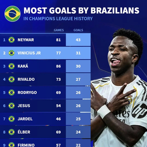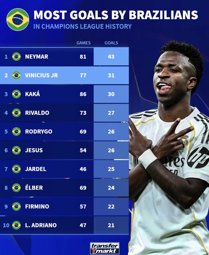 维尼修斯31球居巴西球员欧冠射手榜次席,内马尔43球领跑 虎扑足球 虎扑足球官方账号 02.1818:08 关注 德转统计了巴西球员欧冠历史射手榜。维尼修斯77场比赛中打进31球排名第二,仅此于打入43球的内马尔;排名第三的是打入30球的卡卡。
